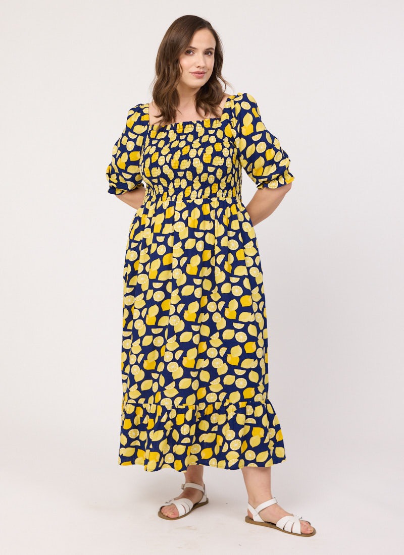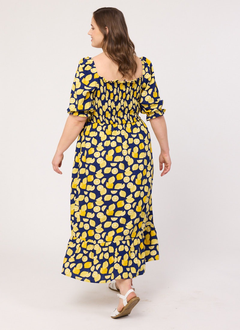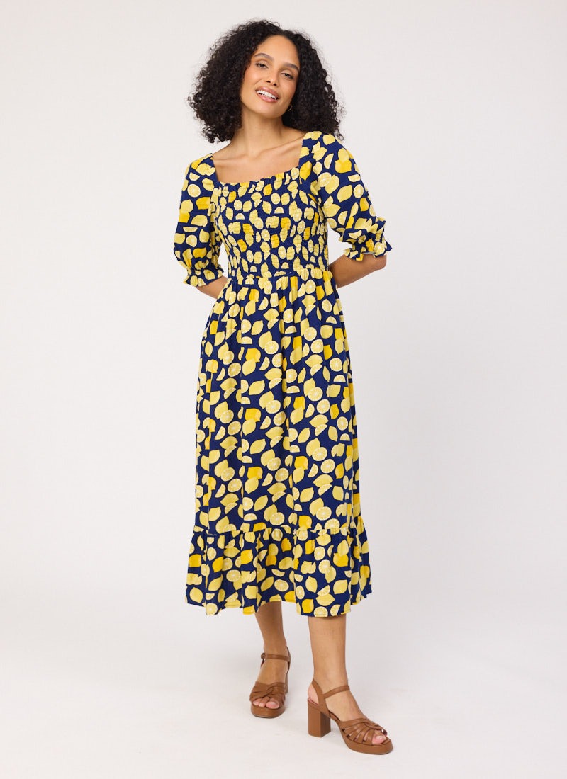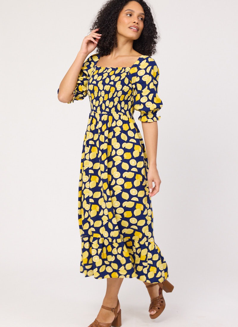 Cinna Lemon Print Square Neck Midi Dress