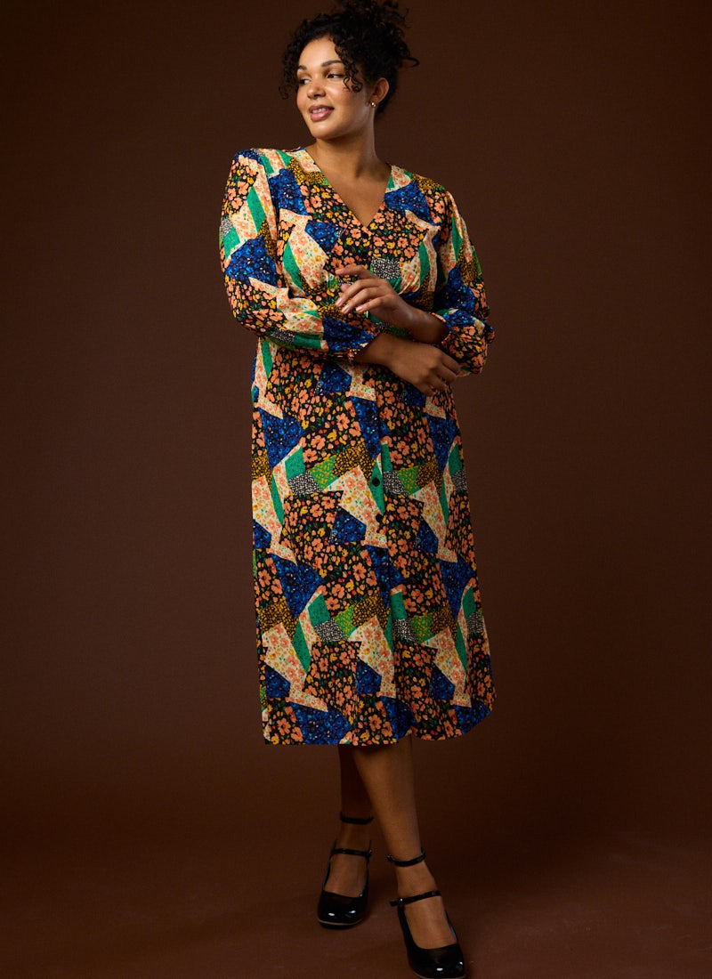Sandra Patchwork Floral Print Long Sleeve Midi Dress