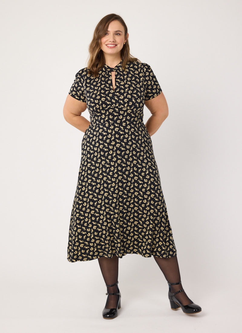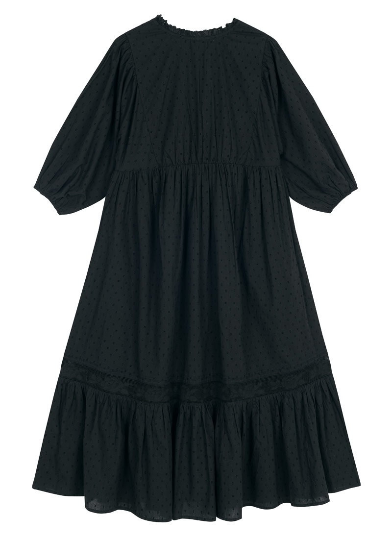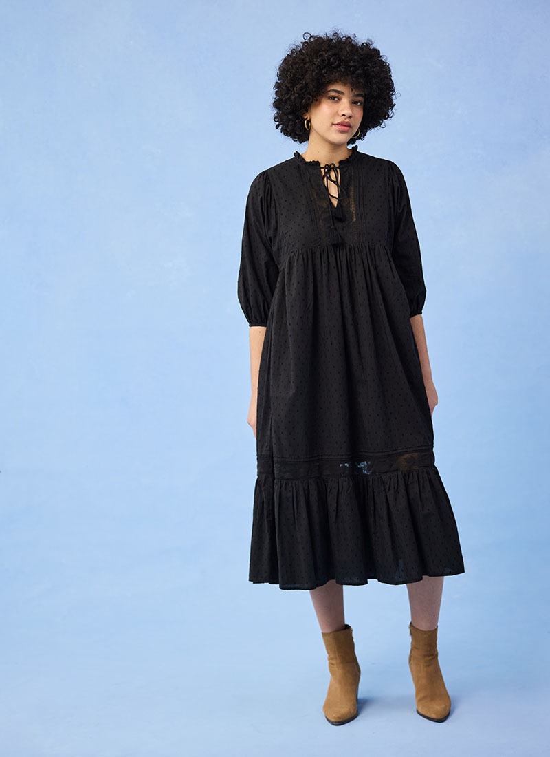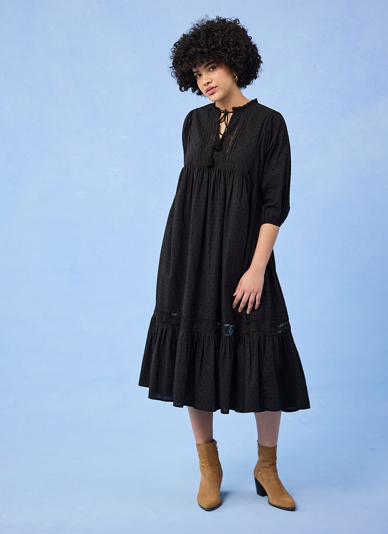 Meryl Tie Neck Dobby Midi Dress - Black