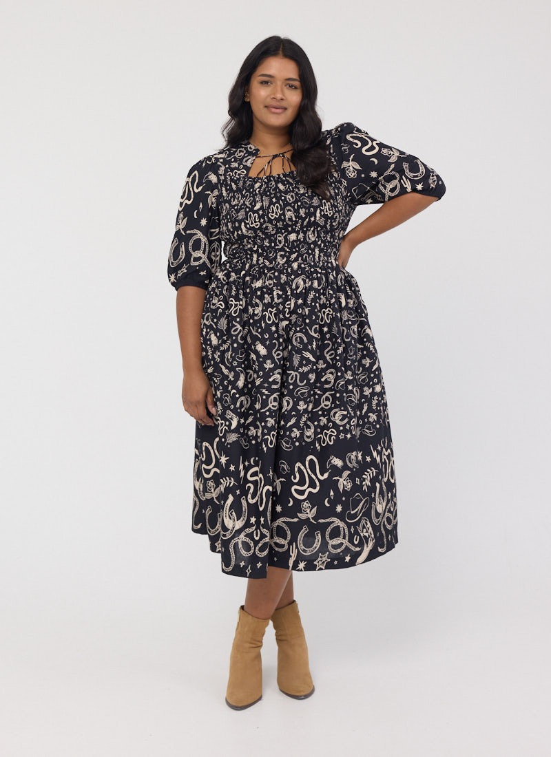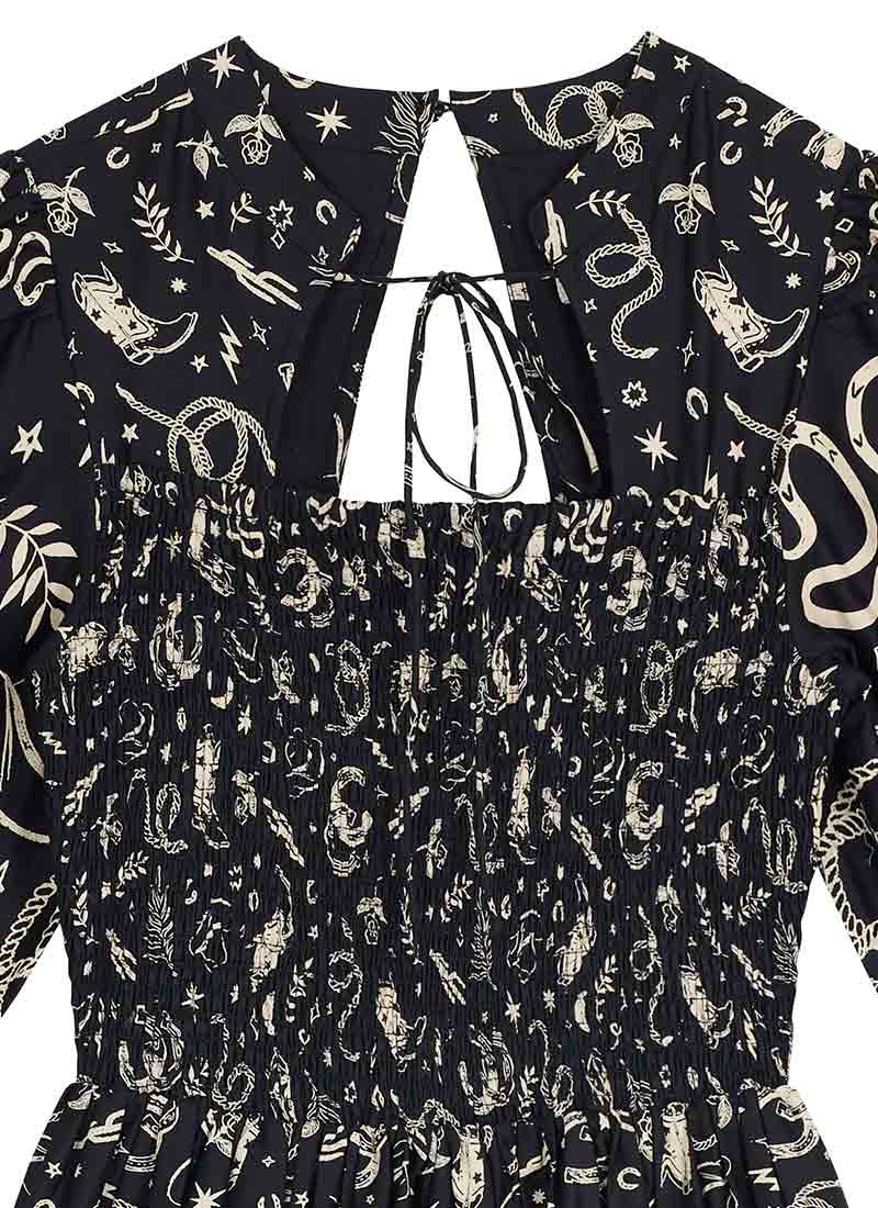 Jesse Western Print Tie Neck Midi Dress - Black