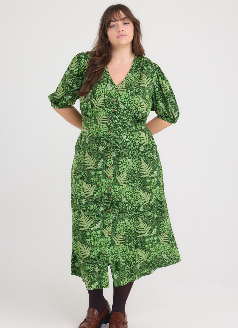 Rebecca Leafy Forest Print Puff Sleeve Midi Dress