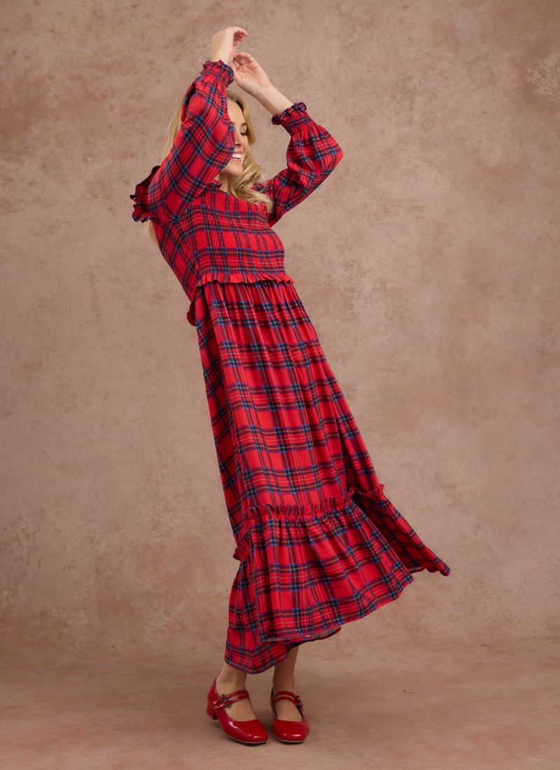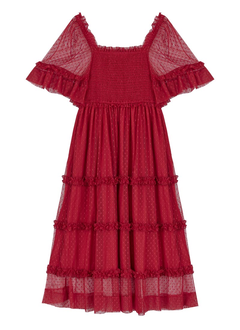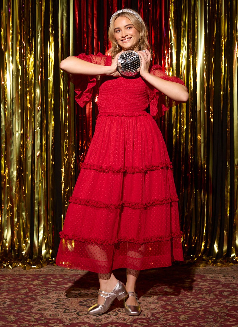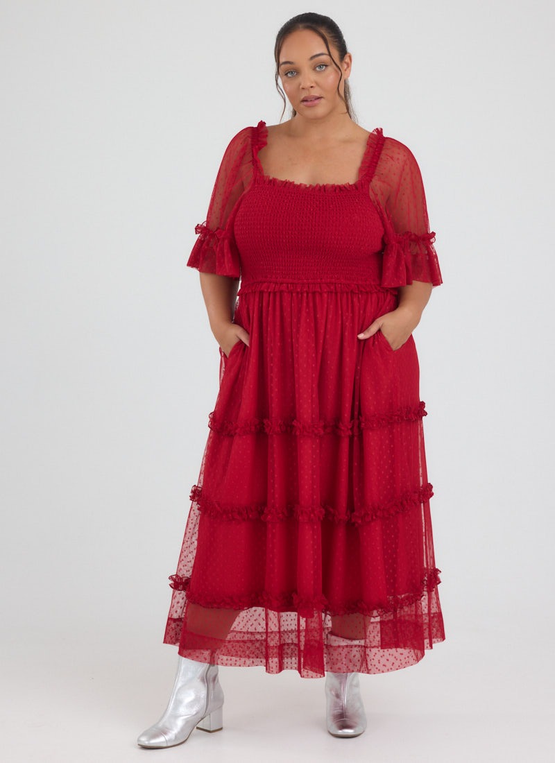 Jemima Square Neck Polka Dot Mesh Dress - Scarlet