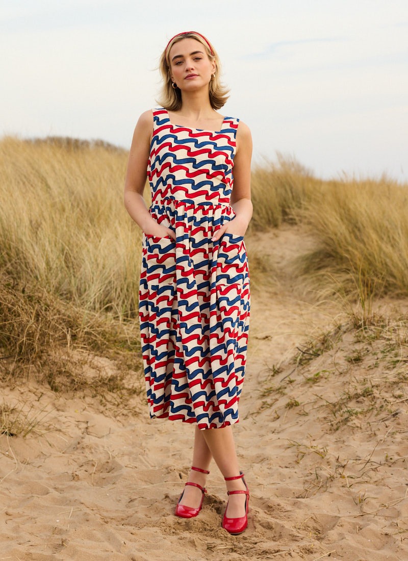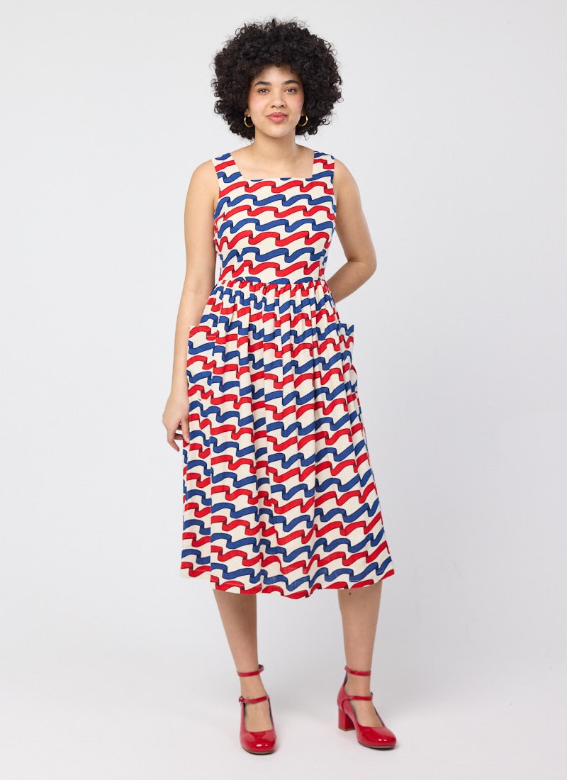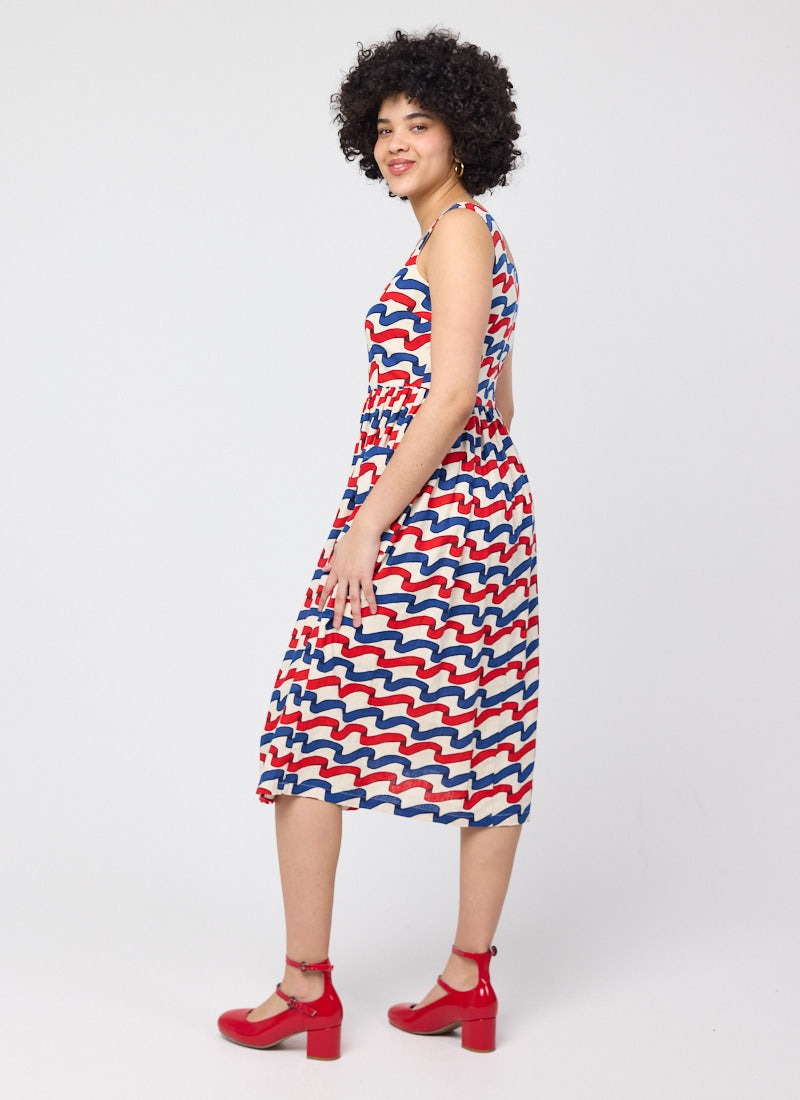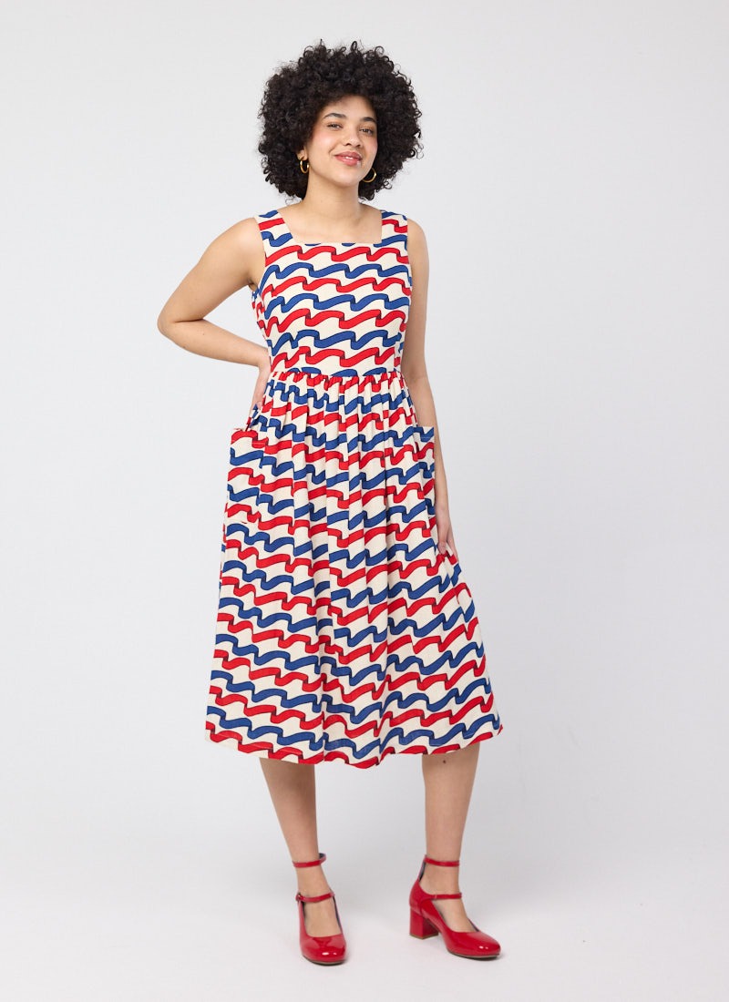 Sandy Square Neck Ribbon Stripe Print Midi Dress
