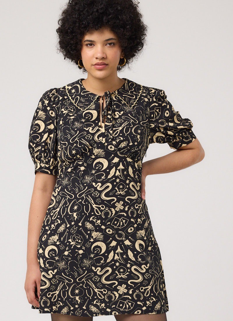 Hattie Whimsical Macabre Print Tie Neck Dress