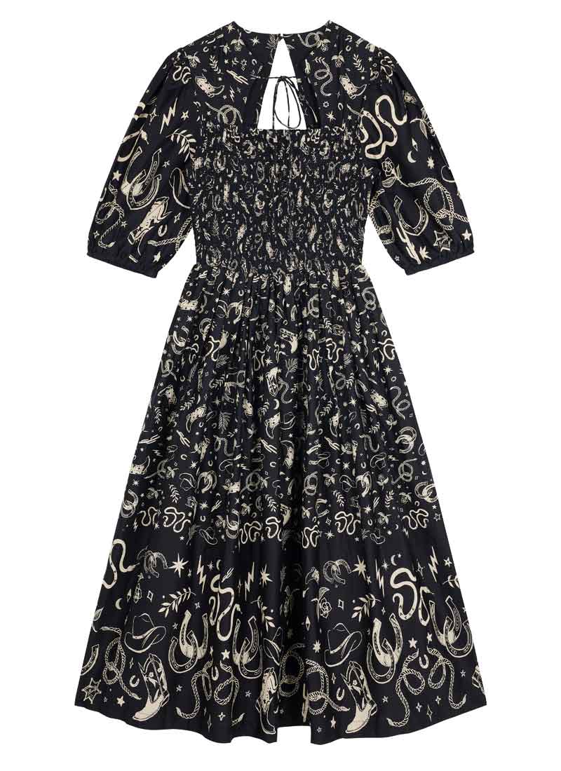 Jesse Western Print Tie Neck Midi Dress - Black